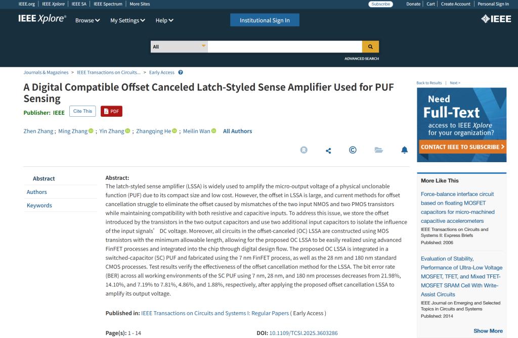 近日,公司博士研究生张震在国际电路与系统领域旗舰期刊IEEE Transactions on Circuits and Systems I: Regular Papers (TCAS-I)上发表论文,论文题为“A Digital Compatible Offset Canceled Latch-Styled Sense Amplifier Used for PUF Sensing”。 本文提出的OC LSSA基于最小栅长的MOS晶体管实现,便于兼容先进工艺与数字设计流程,并有效降低 PUF 的偏置与误码率。