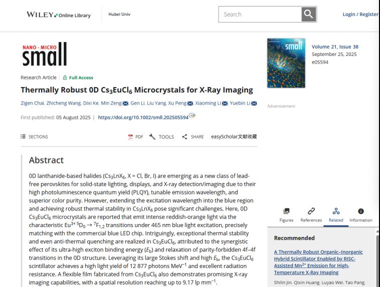 近日,国际著名期刊《Small》在线发表了公司李岳彬教授团队在柔性X射线探测器领域的最新研究成果—“Thermally Robust 0D Cs3EuCl6 Microcrystals for X-Ray Imaging”。其中,公司硕士研究生柴子根为第一作者,公司李岳彬教授、曾敏副教授,化学化工公司彭旭副教授和南京理工大学李晓明教授为通讯作者,w66为第一通讯单位。