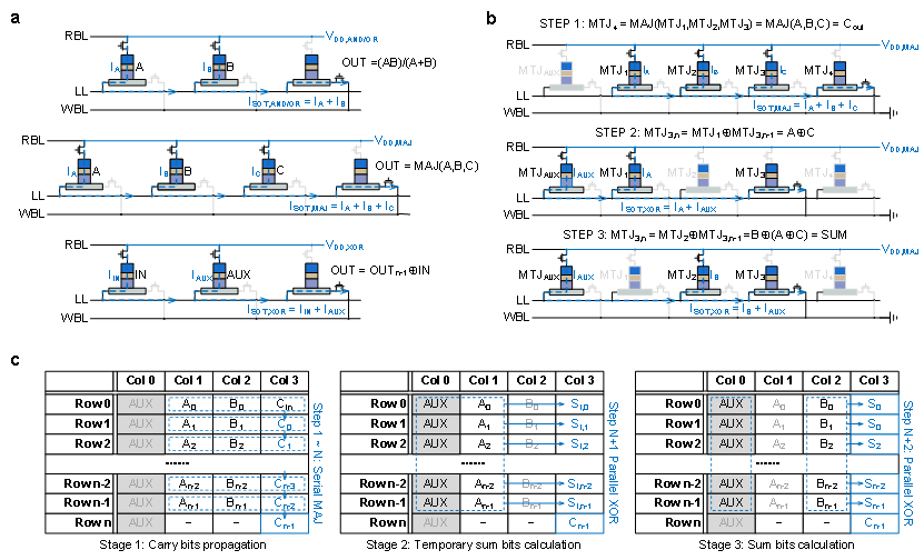 图2 | STIMC架构实现的存内数字计算电路。a(自旋逻辑门原理图:或/与门、多数门以及异或门);b(基于多数门与异或门的全加器);c(n位自旋行波进位加法器的映射示意图与运算流程)。