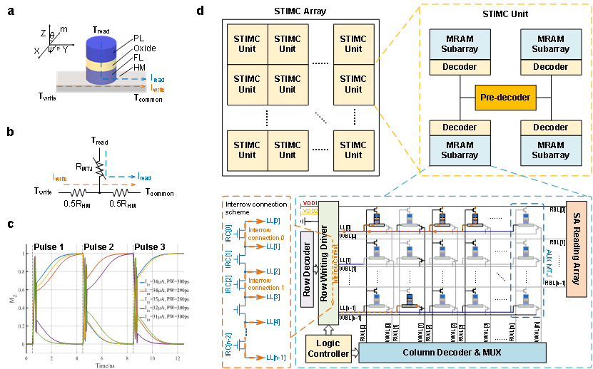 图1 | STIMC各层级架构。a(单极SOT-MRAM结构);b(SOT-MRAM等效电路);c(单极器件翻转特性);d(STIMC计算架构)。