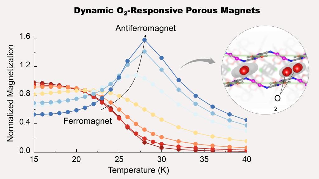 研究人员将氧气分子逐步引入一种层状金属有机框架材料中,发现材料的磁性发生了显著变化,原本的铁磁性逐渐被反铁磁性所取代,其反铁磁转变温度从17 K升高至28 K。这一过程不是突变,而是随着氧气吸附量的增加逐步演化,展现出一种协同、自适应的“相变过程”。通过时间分辨的气体吸附与磁学测试,研究团队捕捉到氧气分子在孔道中扩散、并逐步诱导磁畴演化的全过程。进一步的密度泛函理论(DFT)计算表明,氧气二聚体在孔道中能够充当“自旋桥梁”,在不同磁性层之间建立起新的反铁磁耦合通路。