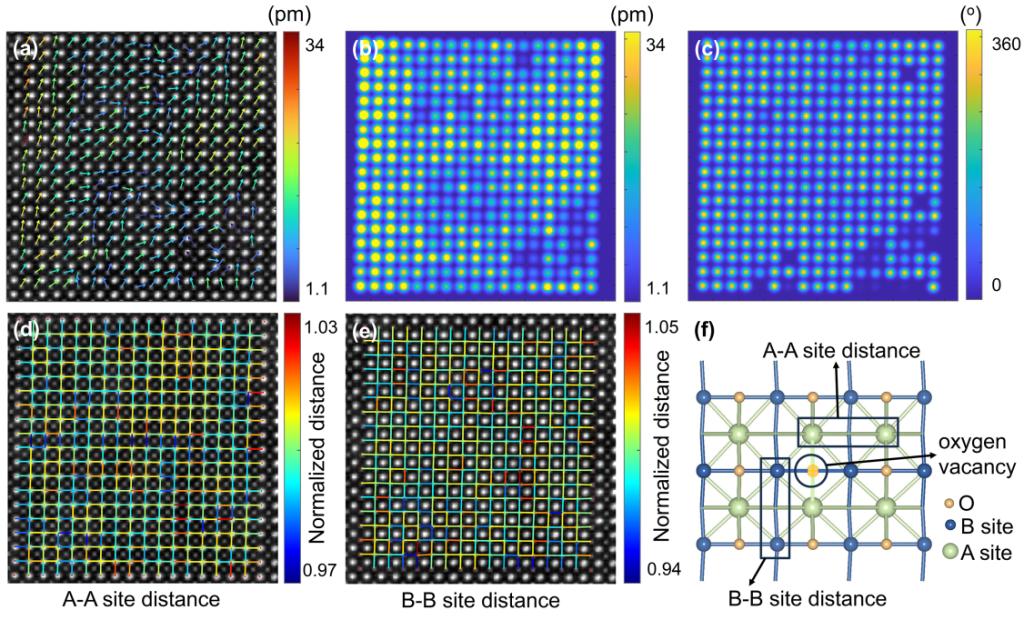 图1.(a)已淬火BNT-Fe/Mn-NBT陶瓷样品沿[001]晶向的带有极化矢量映射的HAADF-STEM图像;(b)极化矢量幅度谱;(c)极化矢量相位谱;(d)图(a)中A位离子间距统计映射;(e)图(a)中B位离子间距统计映射;(f)已淬火BNT-Fe/Mn-NBT陶瓷样品沿[001]晶向晶体结构图。