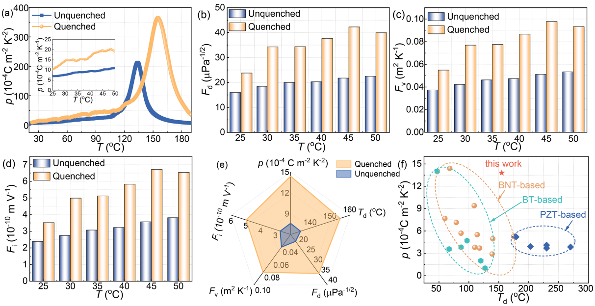 热释电红外探测器通过感知红外辐射温度变化产生电荷信号,在红外成像、安防监控、智能家居等领域具有广泛应用。然而,传统含铅材料(如PZT)存在环境污染问题,而现有的无铅BNT基材料长期受限于室温热释电系数(proom)和退极化温度(Td)之间的相互制约,难以兼顾高灵敏度和高温稳定性。研究团队通过对BNT-Fe/Mn-NBT铁电陶瓷进行淬火处理,系统研究了其微观结构演变与性能调控机制。研究发现,淬火工艺可精准调控材料中的A/B位原子位移和氧空位分布,显著增强晶格畸变并提升热释电响应;同时,氧空位诱导的非均匀随机场有效抑制了铁电退极化,大幅提高了材料的热稳定性。最终,优化后的材料表现出优异的综合性能:室温热释电系数高达13.8×10−4C m−2K−1,退极化温度提升至155°C。基于该材料制备的红外探测器核心性能指标达到国际先进水平:电压响应度:5906 V W⁻¹,噪声等效功率:2.0×10⁻⁹ W Hz⁻¹/²,探测率1.8×10⁸ cm Hz¹/² W⁻¹。